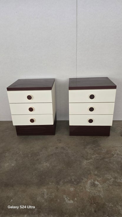 Apportez du charme et de la fonctionnalité à votre chambre avec cette paire de tables de nuit vintage. Leur design mêle élégance et praticité, parfait pour un intérieur au style rétro ou contemporain.