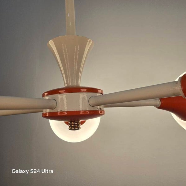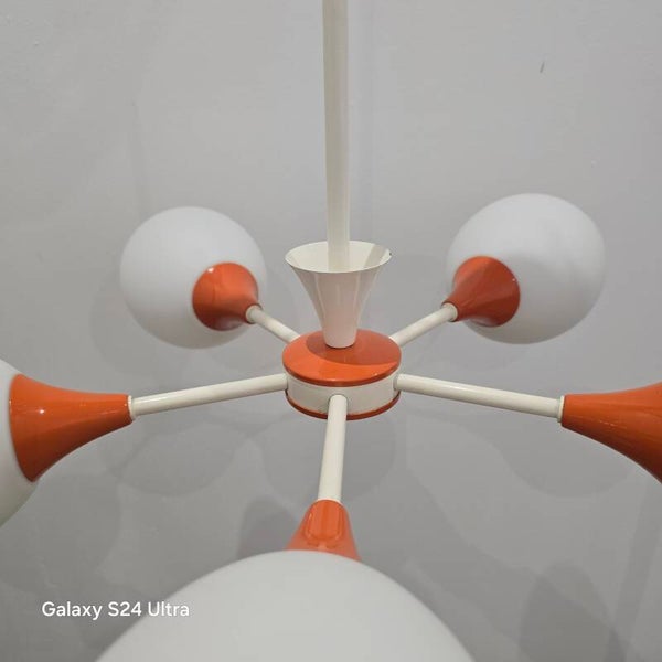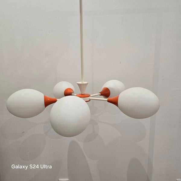 Ajoutez une touche rétro et audacieuse à votre décoration avec ce lustre Spoutnik des années 70. Inspiré de l’esthétique spatiale de l’époque, ce luminaire iconique séduit par son design graphique et sculptural.