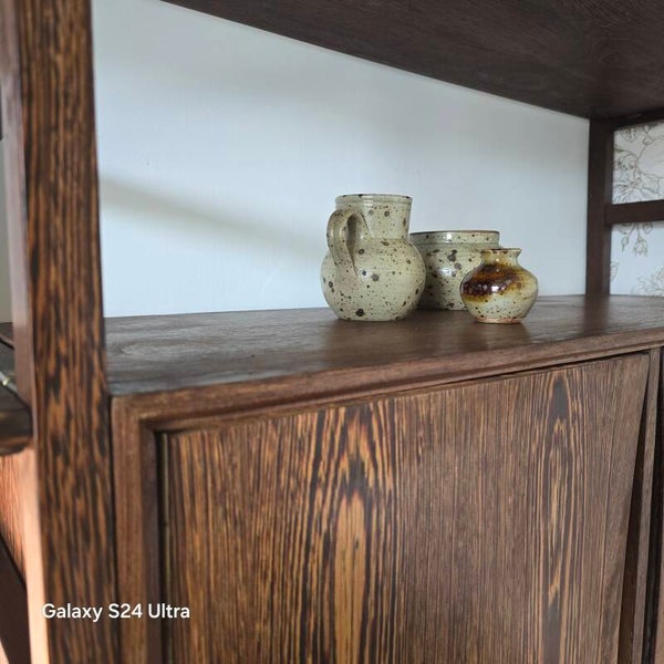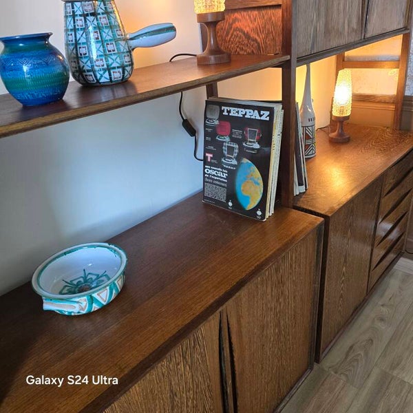 Son style épuré et ses lignes graphiques typiques de l’époque offrent à la fois une grande capacité de rangement et une vraie présence décorative. Idéal pour une bibliothèque, un bureau ou un salon, ce système mural combine esthétisme et praticité.