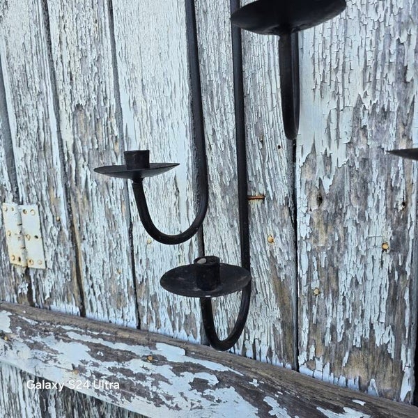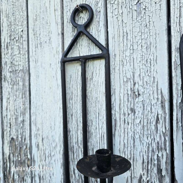 Superbe paire de bougeoirs muraux en fer forgé, au design élégant et minimaliste. Leurs lignes graphiques et épurées rappellent l’artisanat traditionnel, tout en s’intégrant parfaitement dans un intérieur contemporain, bohème ou rustique.