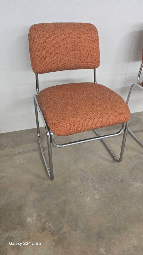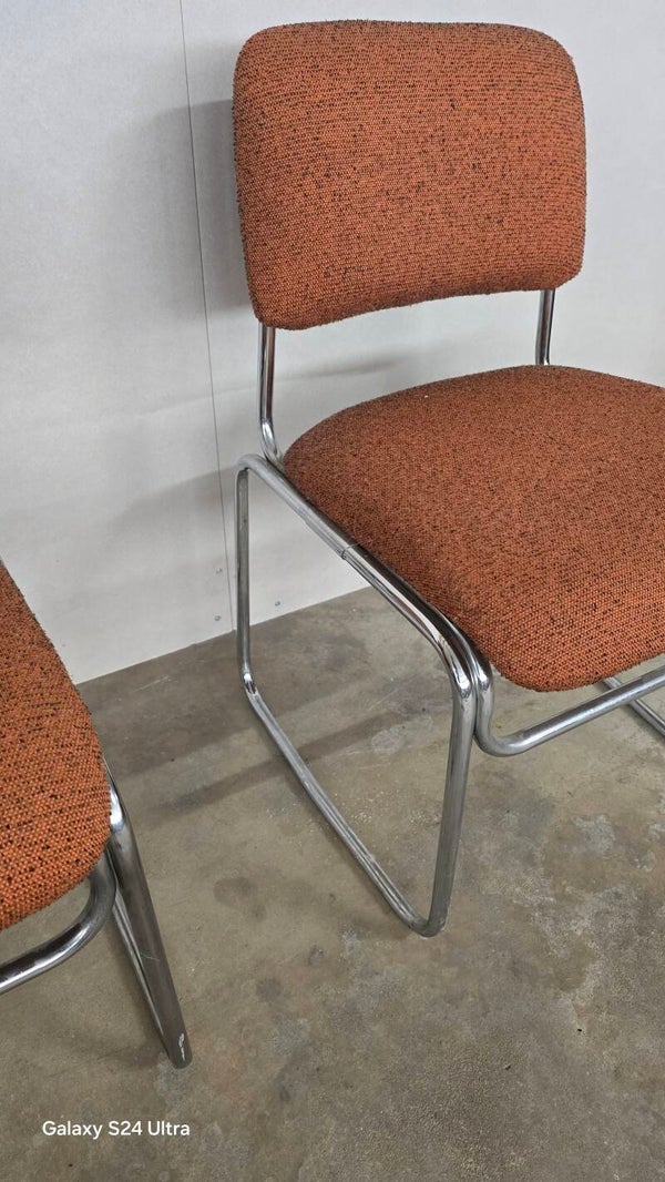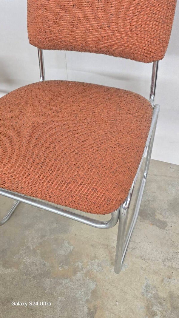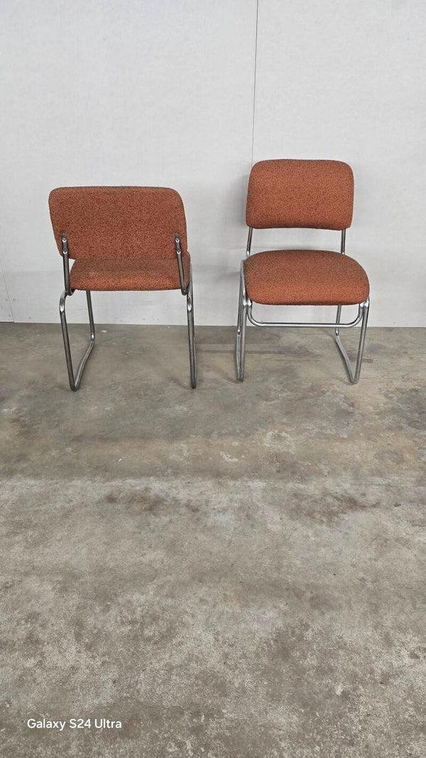 Paire de chauffeuses vintage – Tissu orange & piètement traîneau chromé (années 70)